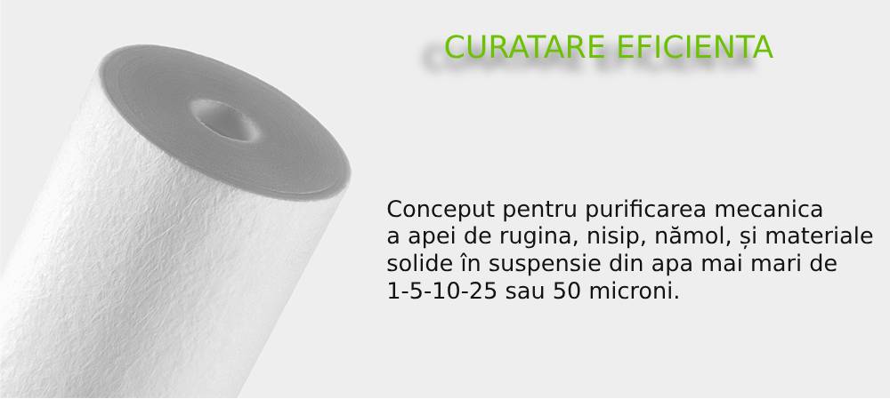 PP 1 – 10ВВ – un cartus din polipropilena spumata, conceput pentru purificarea mecanica a apei de rugina, murdarie, nisip si alte impuritati insolubile mai mari de 1 micron.